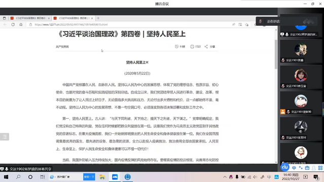 2022年10月27日,我院学生第二党支部于腾讯会议线上开展第十周双周理论学习活动。会议由党支部书记范晶晶主持,支部全体党员参加。