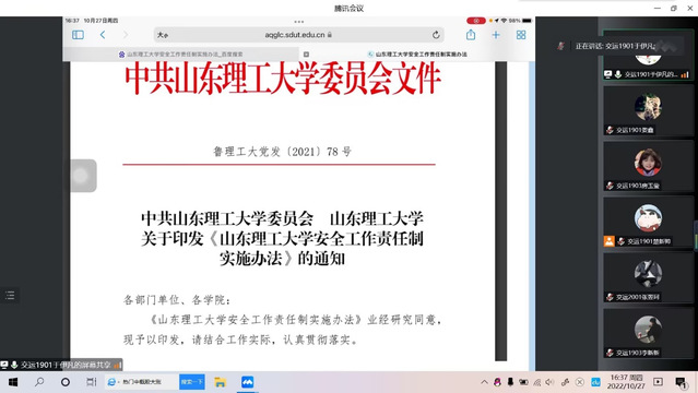 之后,由于伊凡同志带领支部全体党员学习了山东理工大学安全生产责任制实施办法。办法对山东理工大学的各方面安全工作做了明确的规定,成立了学校安全工作领导小组,组长由学校党委书记和校长共同担任,副组长由相关学校领导担任,成员由相关单位负责人组成。安全。学校安全工作主要包括学生安全、消防安全、餐饮卫生安全、实验室安全、校园公共安全、安全生产等方面。同时,学校安全工作坚持“党政同责、一岗双责、齐抓共管、失职追责”的原则,实行党委统一领导,党政齐抓共管,全员共同参与的工作机制,切实确保做好学校安全工作。