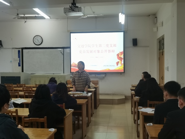 2022年10月28日下午,交通学院学生第二党支部在12号教学楼213教室召开党员发展对象公开答辩大会。此次会议由支部书记范晶晶主持,全体支部成员共同参加。