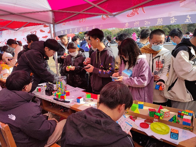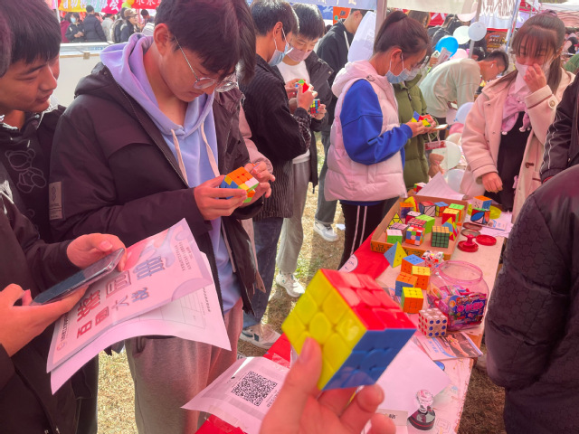 虽然此次百团“历经艰辛”多次推迟,但各社团及同学们的热情并未因此减退。百团当天,各社团互促互进,同学们积极参与活动,现场热闹非凡。在魔方协会摊位面前的魔方拼图深受同学们的欢迎与赞叹。