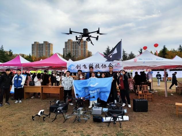当活动接近尾声,会长王俊杰召集社团全部工作人员与会旗、无人机在展位前进行合照,活动完美结束。
