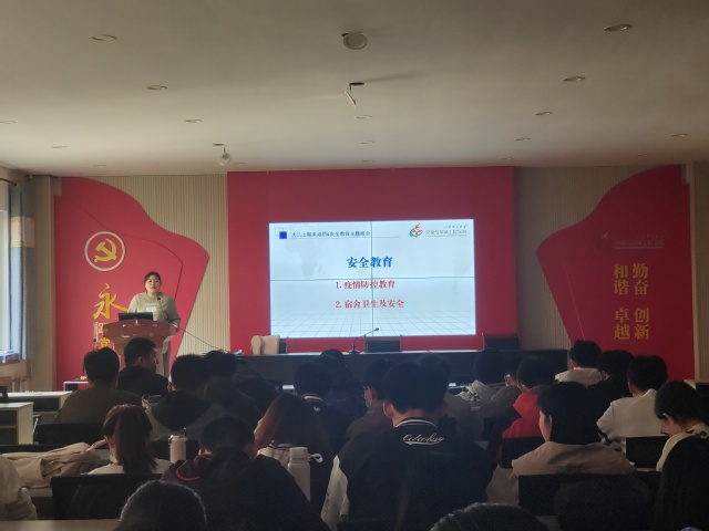 会议伊始姜瑞瑞强调了当前疫情形势的严峻性,告诫同学们要守牢安全底线,共筑安全屏障,对于疫情防控切不可掉以轻心,要毫不松懈。她结合近期疫情防控过程中的案例,向同学们详细解读了近期的疫情防控政策,告诫同学们在疫情期间坚持不信谣、不传谣、不造谣,共同维护良好的社会秩序,自觉落实疫情防控措施,严格遵守学校的防疫政策,做好自我防护,自觉佩戴口罩等等,为自己负责,也是为他人负责。