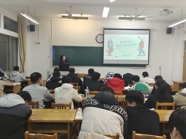 3月2日晚上,学院能动2103班在12号教学楼214教室开展“寒假归来话实践”主题团日活动,总结寒假社会实践活动并且交流分享班级内各个团队取得的成果。此次团日活动由班长付启典、团支书张雯欣主持,能动2103班全体同学参加。