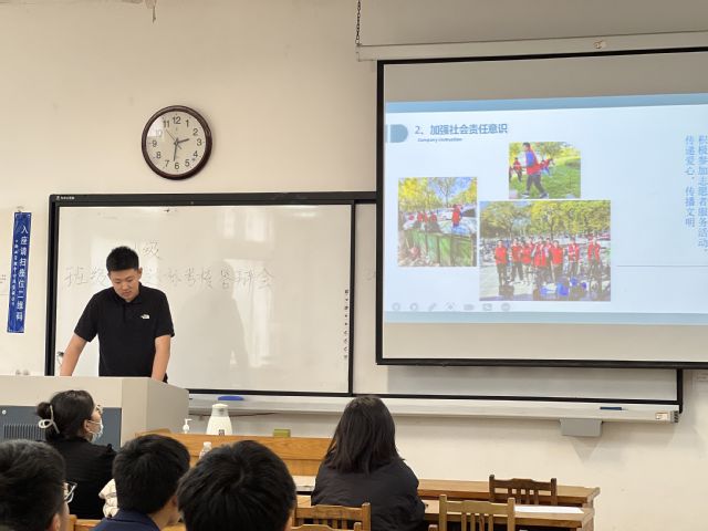 答辩会分为PPT汇报和现场提问两个环节。各班答辩人采用PPT对班级建设情况进行汇报,他们围绕思想建设、组织建设、文化建设、学风建设等方面全面总结了班级在过去一学期开展的主要工作,畅谈工作经验和举措,分享工作成绩和问题困难,并对新学期的工作进行展望。与会评委老师结合各班级日常表现,与班级答辩人深入交流,有针对性的指出了各班级在建设过程中的亮点及存在的问题,并提出建议与方法。在场的其他班委不时记录,互相交流与学习其他班级的先进经验,反思自己在班级建设中存在的不足,取长补短,更好地带动班级积极向上发展。