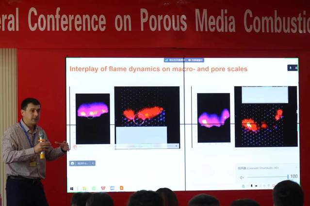 在特邀报告环节,来自俄罗斯托木斯克国立大学的伊戈尔·雅科夫列夫(Igor Yakovlev)教授和俄罗斯科学院西伯利亚分院理论与应用力学研究所的罗曼·弗森科(Roman Fursenko)教授分别以“多孔介质燃烧火焰动力学的孔尺度数值模拟以及窄通道”和“多孔介质中燃烧过程中的非稳态现象”为题作报告;大连理工大学的李本文教授和山东理工大学的史俊瑞教授分别以“多孔介质燃烧及其工业应用研究”和“低热值气体在多孔介质中的燃烧”为题作报告。