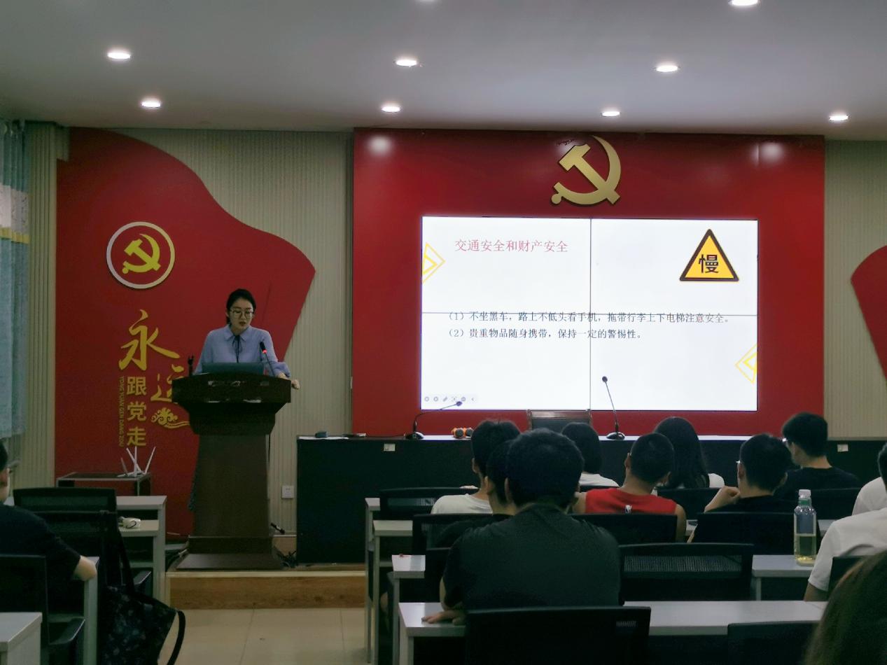 接着,杨雨向同学们传达了暑期离校的相关工作通知,为保证同学们度过一个平安假期,杨雨分别从防诈骗、防传销、防溺水、防交通事故等内容进行强调说明。第一,大家需时刻保持清醒的头脑,警惕网络诈骗,远离网络兼职、传销等诈骗陷阱,保护好个人信息及财产安全。第二,夏季炎热,同学们需提高安全意识,不随意到河、塘游泳,避免发生溺水事件。第三,在假期出行时,要注意交通安全,避免事故发生。最后,杨雨对大家的暑假安排提出期望,希望同学们制定合理的学习生活计划,度过一个充实的假期,同时以积极向上的状态继续迎接新学期的大学生活。