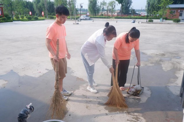 清扫过程中,实践队成员始终保持高度专注力,分工有序,认真清洁,在闷热室外环境下仍坚持打扫,直到庭院恢复了干净整洁的状态。