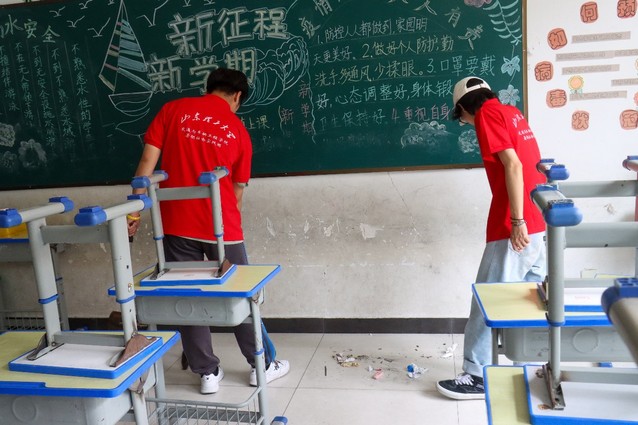 因天降暴雨,恶劣的天气环境导致同学们无法到达校园,实践团队长夏彬提前向同学们发布了停课通知,虽然今天的教学活动暂时无法进行,但是实践团成员们依然准时到达工作岗位,在队长夏彬的指挥下,实践团成员被分为两组,开展对教室的卫生大扫除工作。实践团成员们有的扫地、有的拖地、有的擦桌子……对平常卫生打扫过程中不注意的死角进行了着重清扫。成员们不怕脏不怕累,认认真真的将自己负责的区域打扫的干干净净。