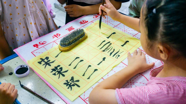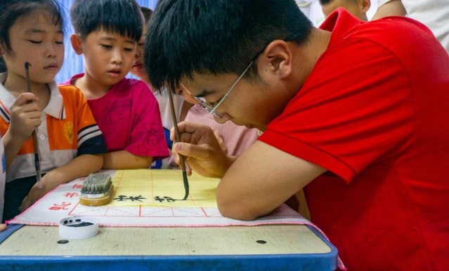 书法课上,在实践团成员带领下,学生热情高涨,从控笔开始练起,不仅提高学生书法水平,更在于修身养性、提高审美趣味,养成细致、专注、沉着、持久的品质。