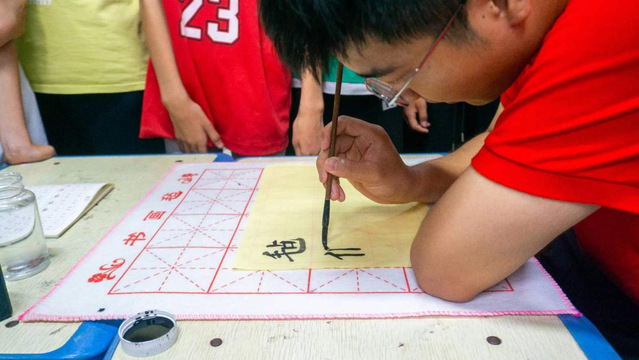 7月12日,“爱之传承”实践团开展“提笔为杆,扬帆起航”书法系列课程。实践团成员杨召珍、王永浩进行授课,致力于提高学生观察与审美能力,激发学生的学习兴趣,增强自信心。