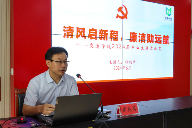 为深入推进党纪学习教育走深走实,引导毕业班党员扣好廉洁从业“第一粒扣子”,6月16日上午,学院党委书记褚兆勇以“清风启新程,廉洁助远航”为题在12号教学楼217室为学院2024届毕业生党员讲授廉洁教育专题党课。