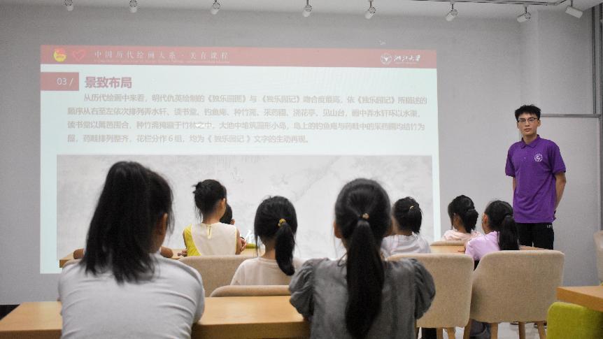 在千年的历史长河中,中国绘画文化如璀璨繁星,而园林绘画更是其中一颗熠熠生辉的明珠。其墨色勾勒的山水间,亭台楼阁错落有致,不仅展现了古人对自然之美的无限敬畏,更蕴含了他们对于生活诗意的深切追求与向往。7月17日下午,山东理工大学“循梦而行”暑期社会实践团积极响应“中国历代绘画大系”全国大学生志愿宣讲活动,联合“绘心绘意”志愿宣讲团在齐悦国际社区为孩子们组织开展“中国历代绘画大系”公开课——园林篇。