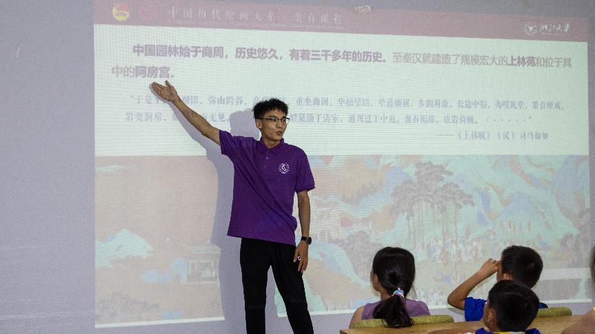 活动伊始,“绘心绘意”志愿宣讲团队长赵慕容同学作为主讲,他以深厚的知识功底和生动的讲解方式,带领大家走进中国园林艺术的奇妙世界。他首先讲解并梳理了中国园林的历史脉络,从先秦时期的宫苑到明清时期的私家园林,每一座园林都承载着时代的印记与文化的精髓。随后,通过与孩子们的互动,赵慕容同学详细阐释了园林与园林绘画之间的密切联系。他表示,园林不仅是人们居住休憩的场所,更是文人墨客寄情山水、抒发情感的精神家园。而园林绘画,则是对这一精神家园的艺术再现,它以其独特的审美视角和表现手法,将园林之美凝固于纸墨之间。