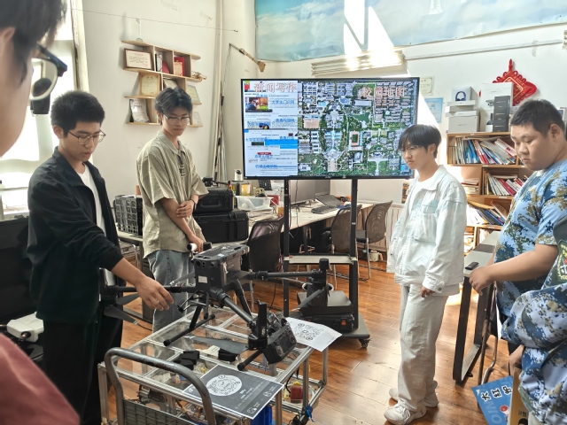 讲解员介绍道,目前,创飞科技社团以大疆经纬M300作为主要技术器,搭载L1、H20T等镜头,致力于无人机负载软硬件开发、无人机负载装配、桥梁检测、二维正射及倾斜摄影三维建模,完成了农田检测、航拍乡村地图、三维建模立体架构、电力系统巡检等项目,并在2023年成功搭建出无人机数字化乡村信息平台。同时,作为山东理工大学唯一一支职业化、专业化的无人机团队,创飞科技协会积极参与学校无人机航拍摄影活动,在多方面、多层次进行科技服务奉献。
