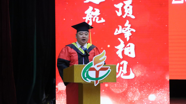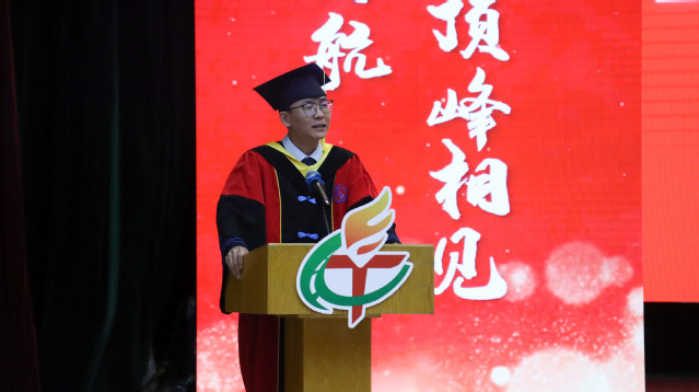 学院院长李波致辞。他向全体毕业生表示热烈的祝贺,深情回忆学子们四年间从军训、课堂、实验室到考研复习的难忘点滴,并高度赞扬了2025届毕业生的优异成绩。在同学们即将踏上人生崭新征程之际,他提出三点期许:一是要像“利剑出刃”般锐意进取,以“扬帆起航”的昂扬姿态勇敢迎接未来的挑战;二是要胸怀“天高海阔”的远大格局,在各自的人生道路上脚踏实地、稳步前行;三是要将毕业视为“学途始发”的新起点,在未来的征程中“再续芳华”,用奋斗书写人生新篇章。