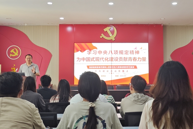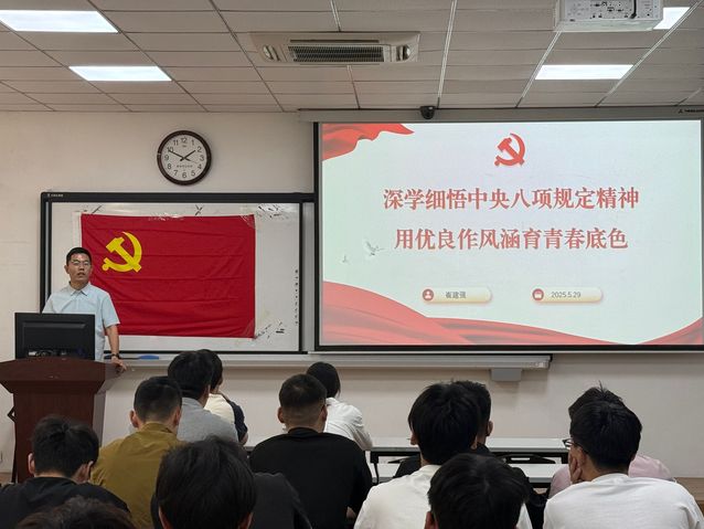 学院党委书记褚兆勇为毕业班党员讲授了题为“将作风建设进行到底,锲而不舍落实中央八项规定精神”的专题党课。他从作风建设的重要性出发,围绕“党的作风建设关系党和国家前途命运”“八项规定推动党风政风和社会风气大转变”“以案为鉴,守住拒腐防变的防线”“勇当先锋,推动学院事业高质量发展”四个方面进行了深入阐述。他强调,学生党员要以深入贯彻中央八项规定精神学习教育为契机,不忘初心、牢记使命,谦虚谨慎、艰苦奋斗,敢于斗争、善于斗争,主动以刀刃向内的勇气,对标中央八项规定精神,提升服务意识和工作能力,以优良作风涵育青春底色。