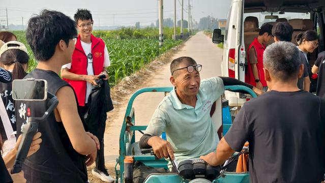 实践团的成员们踩着田埂上的软泥,钻进绿油油的地里。有的蹲下来扒开叶子看看庄稼长得好不好,有的拿着本子写写画画,记着这是啥品种、种了多大一片、从种下到能收要多久。田边的树荫下,几个村民正和他们唠着家常。大爷指着地里的苗说:“前阵子虫子多,叶子被咬得坑坑洼洼,急得睡不着觉。”大妈也凑过来:“天旱的时候浇水得一趟趟挑,累不说,还怕浇不匀。”成员们听得认真,时不时点点头,把这些话也记在本子上,脸上满是仔细的样子。