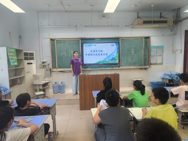 最后,实践团成员向学生们普及了中国核工业发展历程。从1964年中国成功爆炸第一颗原子弹,到近年来中国核工业转向创新和可持续发展阶段,对清洁能源和环境保护的要求增强展现了中国在核能技术领域的坚定决心和创新能力。