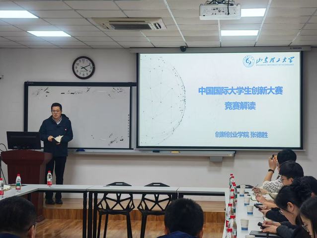 创新创业学院张德胜老师就中国国际大学生创新大赛的相关工作进行了宣讲与动员。张老师结合学院学科特色与往年参赛情况,分析了当前创新竞赛面临的形势与机遇,鼓励全院师生依托专业优势,积极挖掘具有潜力的创新项目,不仅要关注技术突破,更要注重项目的社会价值与落地转化。
