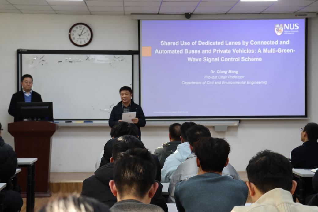 下午,孟强院士在12号教学楼211教室作了题为“网联自动驾驶公交与私家车共享专用车道:多维绿波信号控制方法”的学术报告。他以新加坡智能交通治理实践为引,深入剖析了在自动驾驶车辆普及初期,如何高效、安全地实现自动驾驶私家车与公交车辆共享专用道这一前沿问题,系统阐述了其团队提出的“时空协同控制”创新理念及其基于V2X通信和模型优化的解决方案。报告内容丰富,视角前沿,引发了在场师生的浓厚兴趣。在互动环节,孟院士还就学术研究选题、高水平论文撰写与投稿等话题与师生分享了独到见解,并鼓励大家要从工程实践中凝练科学问题,夯实理论建模与英文写作能力。