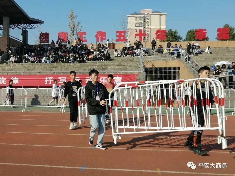 2021年11月13日这天,清风徐来,阳光洒在地面上,一年一度的校运会在田径场举行开幕式,同学们怀着期待的心情参与校运会,各个二级学院都相应准备了节目:充满青春的啦啦操、国风浓郁的舞曲……使我们大饱眼福,大家注意到了田径场上醒目的白色用具-栅栏了吗!负责搬运他们的就是我们的幕后工作者-学生治保委员会,校运会的顺利开幕离不开他们的努力。太阳公公起了个早床,草坪上的露珠还在呼呼睡着大觉,田径场上便开始陆陆续续地来人了,三三两两,来的人正是学生治保委员会的成员,他们手里拿着早餐,因为校运会开幕式即将开始,所以提前在田径场进行准备工作。
