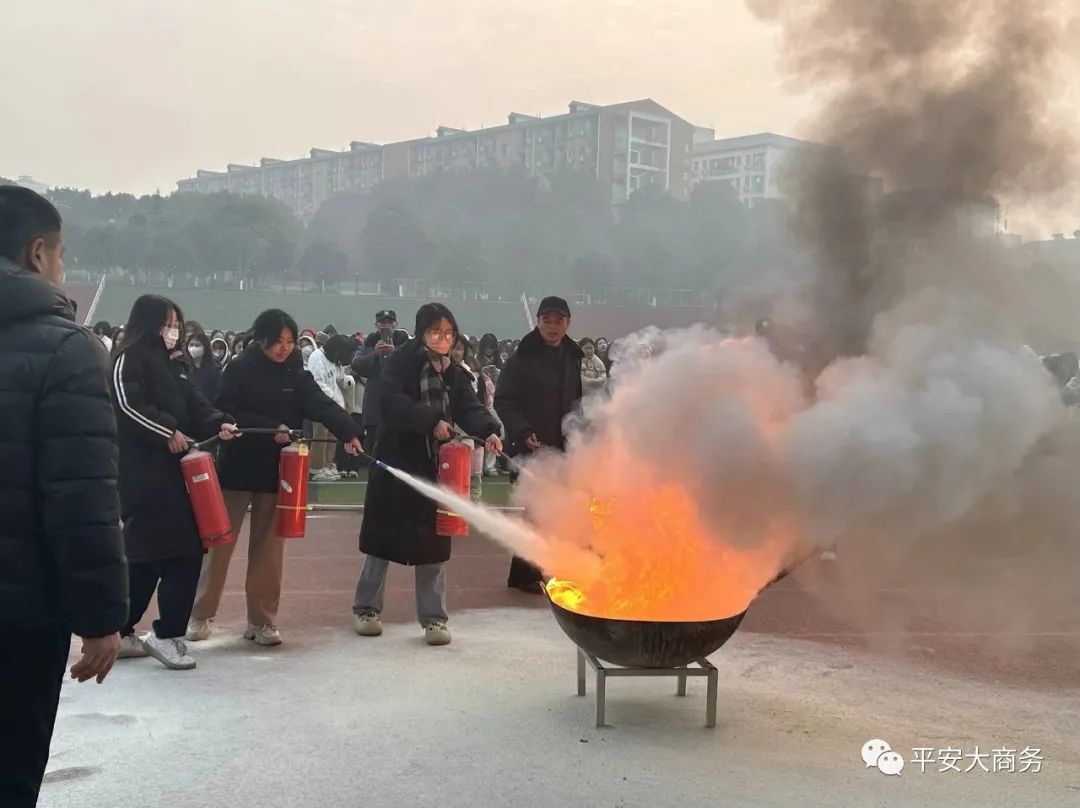 人数汇报完后,学校邀请了专业消防教官现场演示了如何正确使用灭火器,并邀请部分学生进行实际操作,让他们亲身体验使用灭火器扑灭初起火灾的过程。