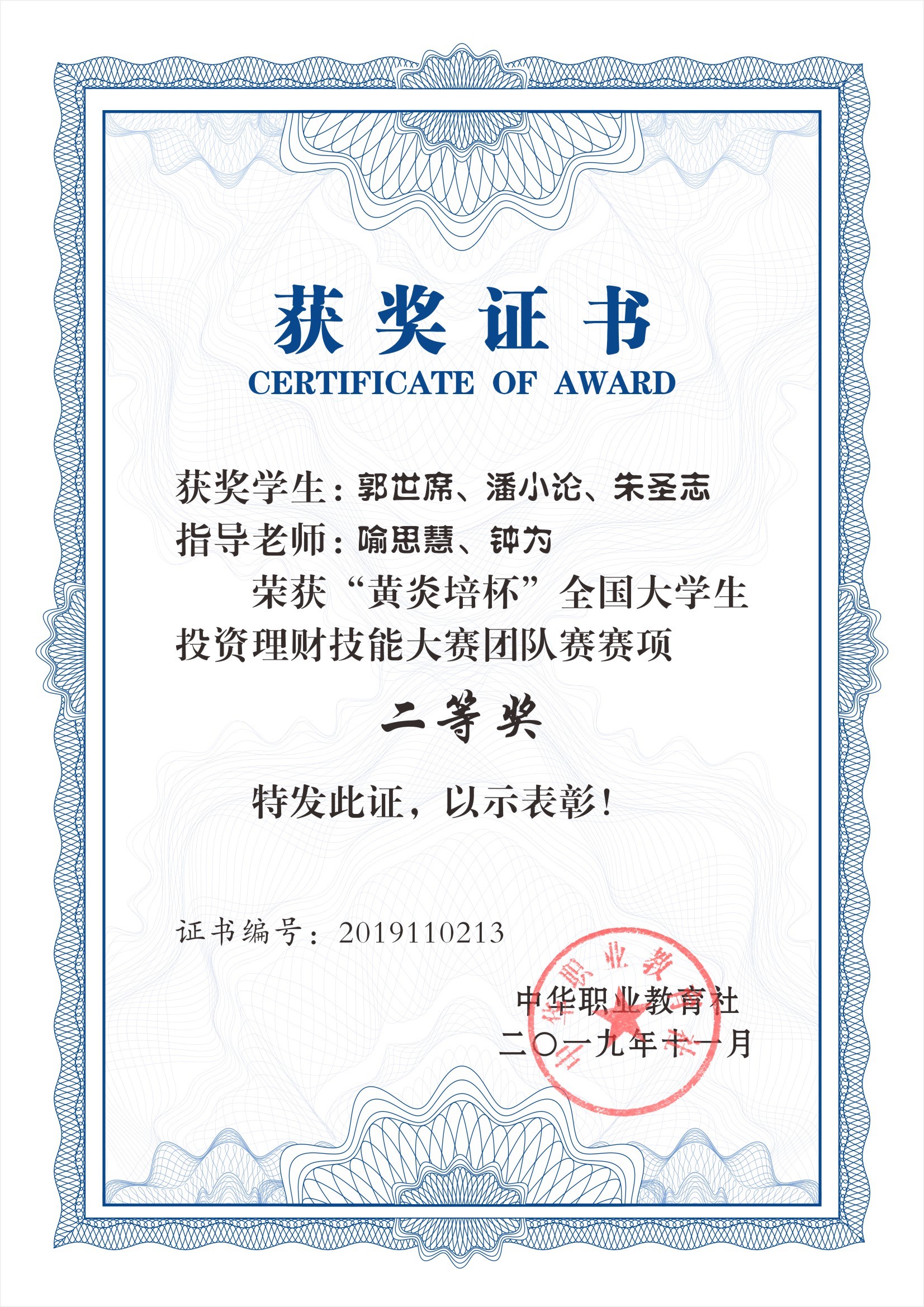 4、2019年“黄炎培杯”全国大学生投资理财技能大赛团体二等奖。