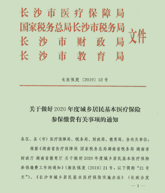 关于做好2020年度城乡居民基本医疗保险参保缴费有关事项的通知(长医保发【2019】52号)