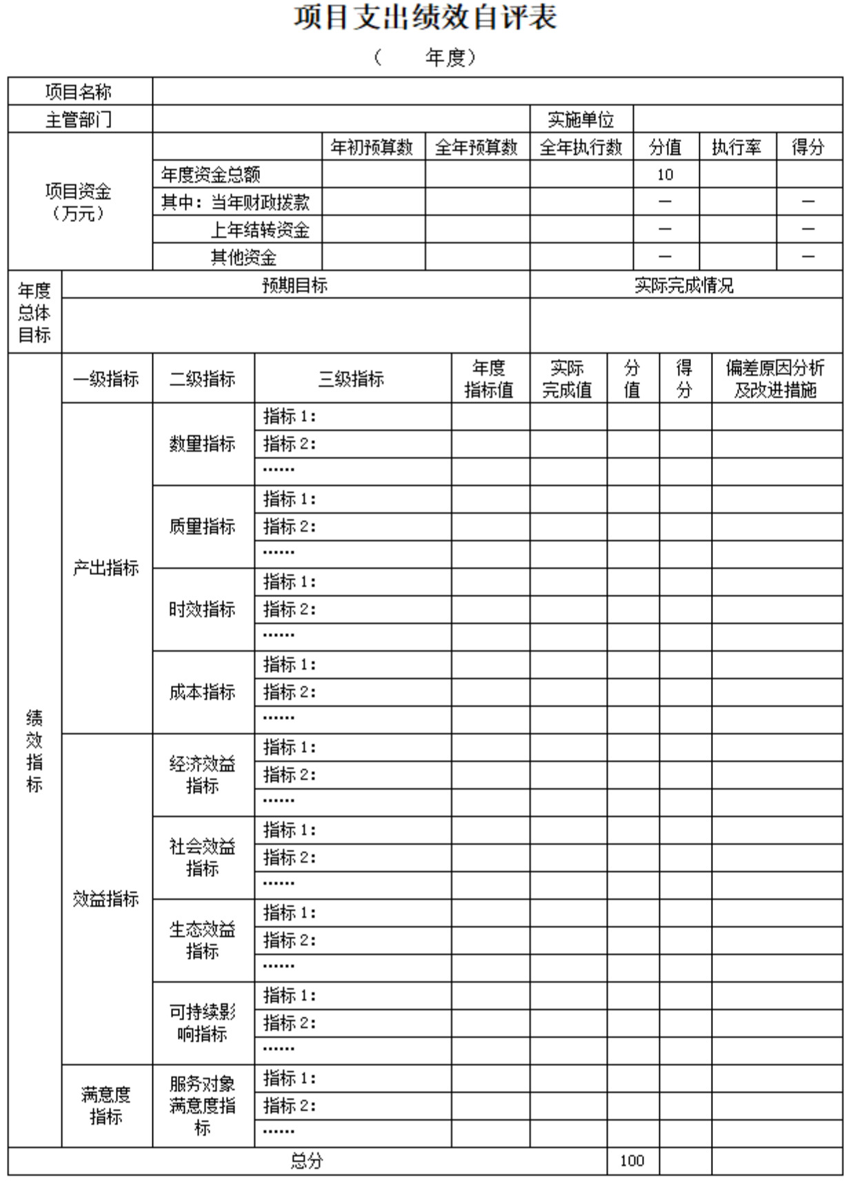 单位自评指标的权重由各单位根据项目实际情况确定。原则上预算执行率和一级指标权重统一设置为: 预算执行率 10%、产出指标50%、效益指标30%、服务对象满意度指标10%。如有特殊情况,一级指标权重可做适当调整。二、三级指标应当根据指标重要程度、项目实施阶段等因素综合确定,准确反映项目的产出和效益。
