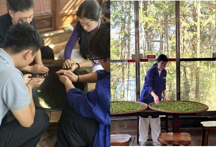 10月28日,同学们转战长沙隐珠谷研学基地,开启了茉莉花茶与绿茶的深度研学之旅。在茉莉花茶体验区,基地导师从茉莉花的选品、窨制次数、提香工艺等方面展开讲解,通过对比不同窨次的茉莉花茶,让同学们清晰分辨出香气浓度、鲜爽度的差异。随后的绿茶制作实践环节更是将活动推向高潮,在罗依斯老师的指导下,同学们亲手参与了鲜叶摊放、杀青、揉捻、干燥等工序,从控制杀青温度到掌握揉捻力度,每一个步骤都反复尝试、细致调整。当亲手制作的绿茶冲泡出清澈明亮的茶汤,鲜爽回甘的滋味在口中散开时,同学们切实体会到了茶叶加工“一分工艺一分品质”的真谛。