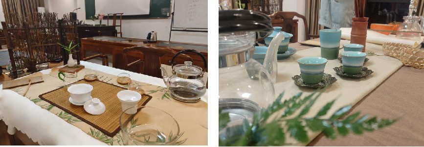 茶席布置与茶艺展示模块是理论与美学、技艺的深度融合。实训前,教师梳理茶席设计的空间美学、茶具搭配的文化逻辑等理论要点;实操时,同学们既互帮互助——有同学分享节气物候的文献资料,有小组交流传统节俗的茶席呈现技巧,有小组借调特色茶具完善席面风格,又各显创意——有的以“禅茶一味”为核心,用枯木枝、黑陶茶壶营造空灵意境;有的融合节气的时序智慧,以青纱似流水,棕麻仿松木打造高山流水的自然情境;茶艺展示中,同学们将冲泡技艺理论(如水温控制、注水手法)融入动作,让茶汤品质与茶艺美感相得益彰。