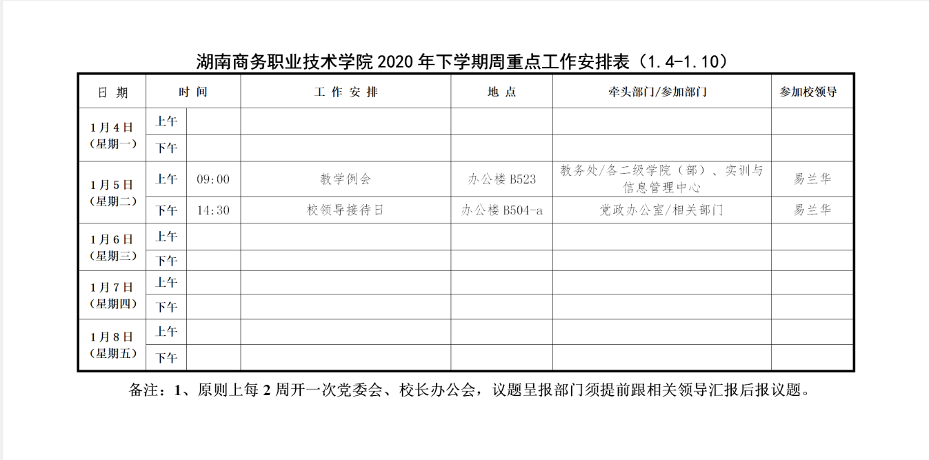湖南商务职业技术学院2021年上学期周重点工作安排表(1.11-1.17)