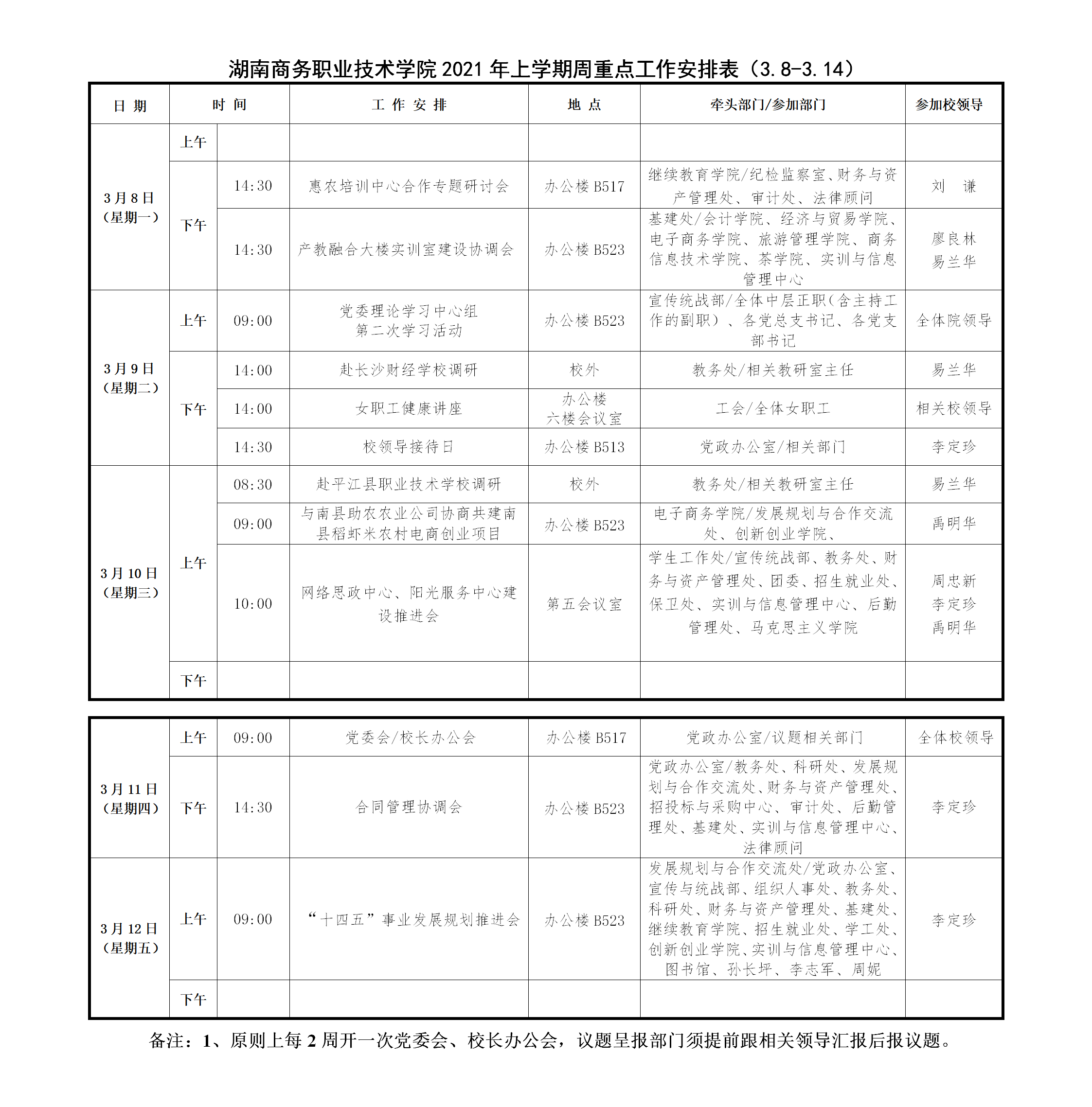 湖南商务职业技术学院2021年上学期周重点工作安排表(3.8-3.14)