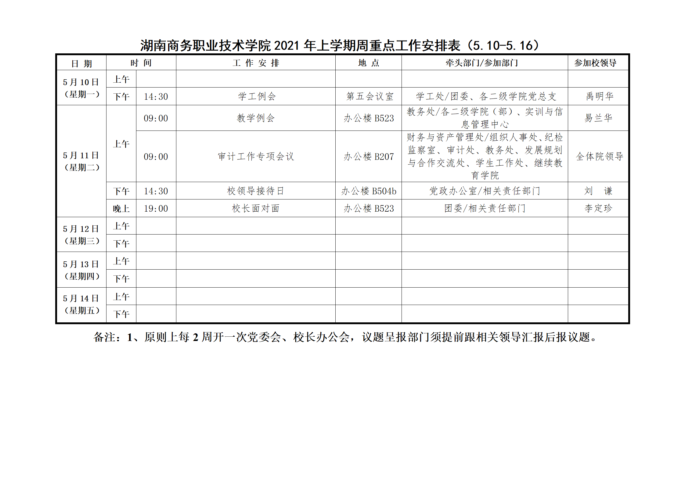 湖南商务职业技术学院2021年上学期周重点工作安排表(5.10-5.16)