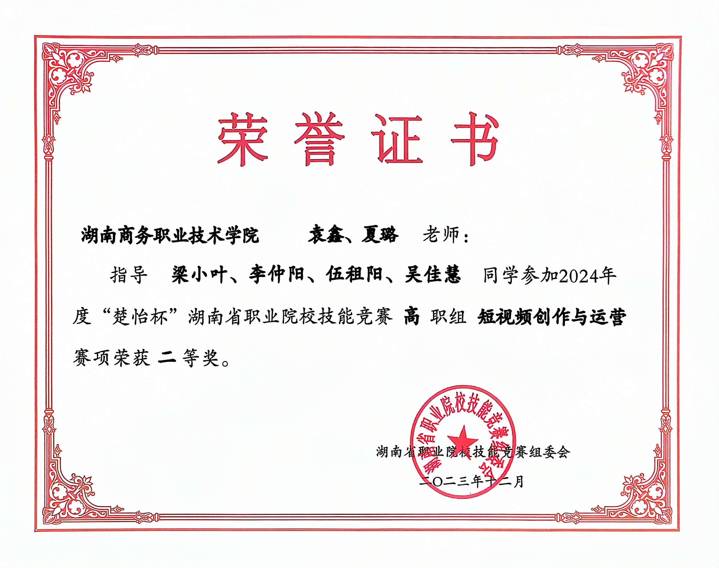 12月8日至10日,由湖南省教育厅、湖南省人力资源和社会保障厅主办,湖南机电职业技术学院承办的2024年度“楚怡杯”湖南省职业院校技能竞赛赛项圆满收官。在此次比赛中,由我院袁鑫、夏璐、方舟老师带队,来自21移商1班梁小叶及李仲阳、21农商2班伍租阳、22电商3班吴佳慧四位同学组成的参赛团队,经过激烈角逐,从93支参赛队伍372名参赛选手中脱颖而出,荣获“短视频创作与运营赛项”二等奖一项。