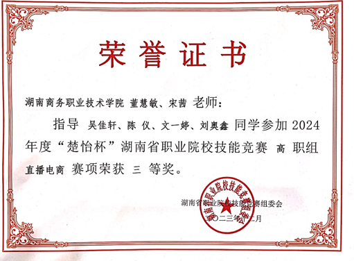 12月15日至16日,由湖南省教育厅主办、长沙商贸旅游职业技术学院承办的2024年度“楚怡杯”湖南省职业院校技能竞赛直播电商赛项收官。在此次比赛中,由我院董慧敏、宋茜老师带队,21移商2班陈仪、22电商3班文一婷、21茶艺1班刘奥鑫、21茶艺2班吴佳轩四位同学组成的团队,经过激烈角逐,荣获直播电商赛项三等奖一项。