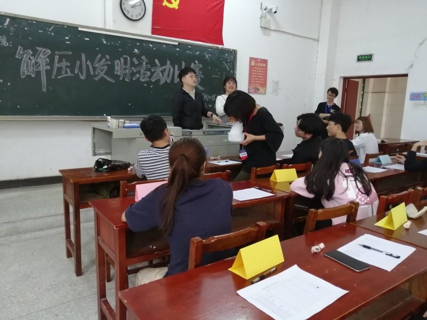 2019年4月25日中午12点30分,为了希望同学们能充分的发挥主观能动性,制作一些小发明去缓解心里压力。电商学院在二教101教室举行了解压小发明比赛活动。