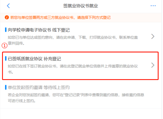 使用学校下发的纸质版就业协议书,填写完信息后给单位盖章,点击“已签纸质就业协议 补充登记”,按页面提示如实进行填报。