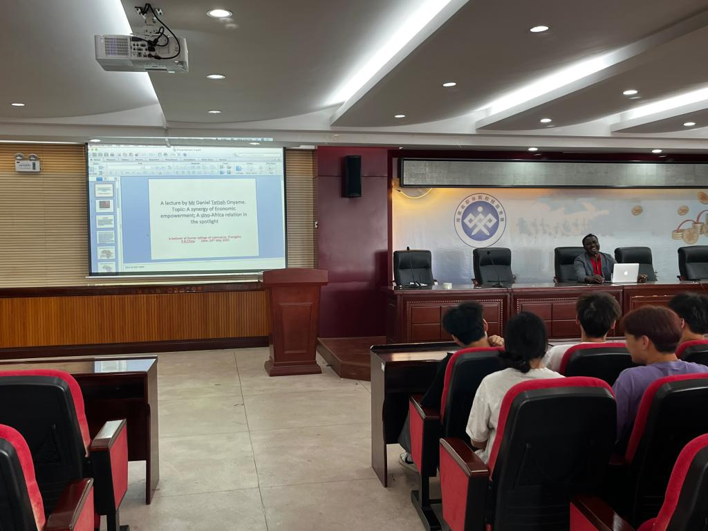 2023年5月24日下午2点半,我院在崇文楼6楼学术报告厅举行了主题为“A Synergy of Economic Empowerment: A Sino-Africa Trade Relation in the Spotlight”(经济赋权的协同效应:备受关注的中非贸易关系)的英语讲座。本次讲座由旅游管理学院专任外籍教师Daniel主讲,发展规划与合作交流处与电子商务学院、旅游管理学院联合组织,一共有100左右学生参加讲座,主要是商务英语、国际商务专业以及其他对国际贸易感兴趣的学生。