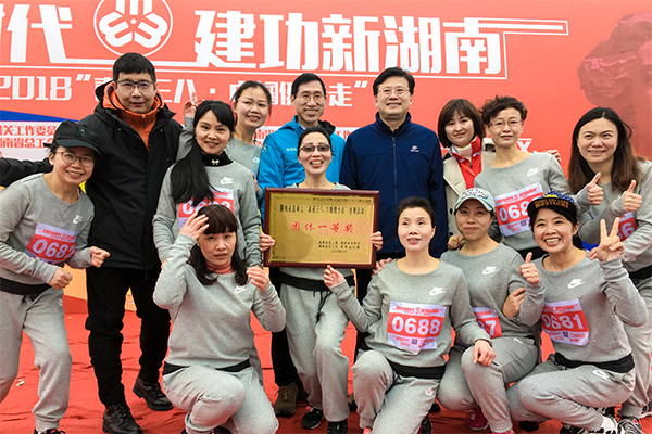 3月7日,由我院10名女职工组队代表省供销合作总社,参加了省直工会女工委举办的“拥抱新时代 建功新湖南” 2018“喜迎三八•巾帼健步走”环橘子洲4.5公里健步走活动。比赛前,队员们刻苦训练,相互鼓励,自信满满;比赛中,奋力拼搏,你追我赶,志在必得!最终,在133支队伍中脱颖而出,以团体第一名的成绩获得了比赛一等奖,为省社和学院赢得了荣誉,进一步扩大了学院在全省直属单位的影响力,为争创卓越院校贡献了微力量。