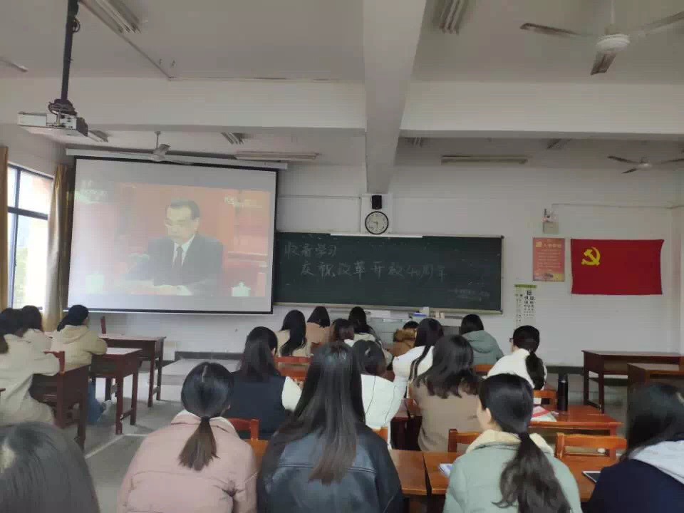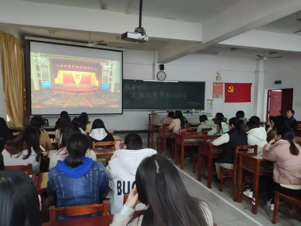 2018年12月19日中午12:30,会计学院学工一、二党支部学生党员在J2-201组织收看庆祝改革开放40周年大会。