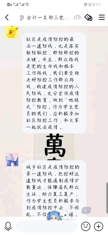 杨巧:抗击疫情,疫情就是命令,防控就是责任。把好疫情防控的入口关,当好疫情防控的“守门员”。 各社区的疫情防控工作也更加严格,面对当前的疫情要严格按照上级的要求,切实加强社区防控,严防严控、严防死守。在疫情面前,作为一名学生党员要同人民群众同舟共济,共同构筑起疫情防控的“钢铁长城”。