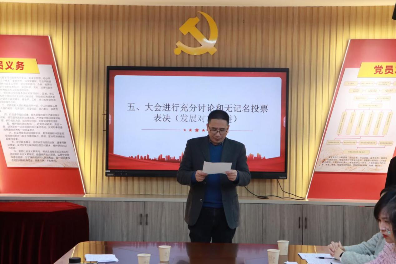 会议严格按照党组织接收预备党员的程序进行。支委会纪检委员刘浩章首先向大会汇报了发展对象的综合政审和群众座谈情况,随后,七位发展对象依次向大会宣读《入党志愿书》,汇报个人对党的认识、入党动机、本人履历、现实表现、未来展望等方面情况。入党介绍人介绍发展对象主要情况及培养教育过程,与会党员进行充分讨论,有表决权的正式党员通过无记名投票方式表决,一致同意接收7位同志为中共预备党员。