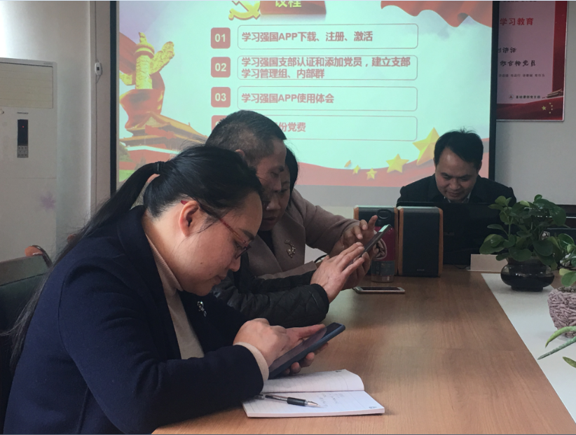 会上,党支部书记吴玉光首先对“学习强国”学习平台进行了详细介绍,“学习强国”平台由中央宣传部建设,于今年1月1日上线,是贯彻习近平总书记关于加强学习、建设学习大国重要指示精神、推动全党大学习的有力抓手,是新形势下强化理论武装和思想教育的创新探索,是推动习近平新时代中国特色社会主义思想学习宣传贯彻不断深入的重要举措。随后,各位党员讨论了“学习强国”学习平台的使用方法、板块、栏目、积分规则等,并建立支部学习管理组、内部群进行沟通学习交流。