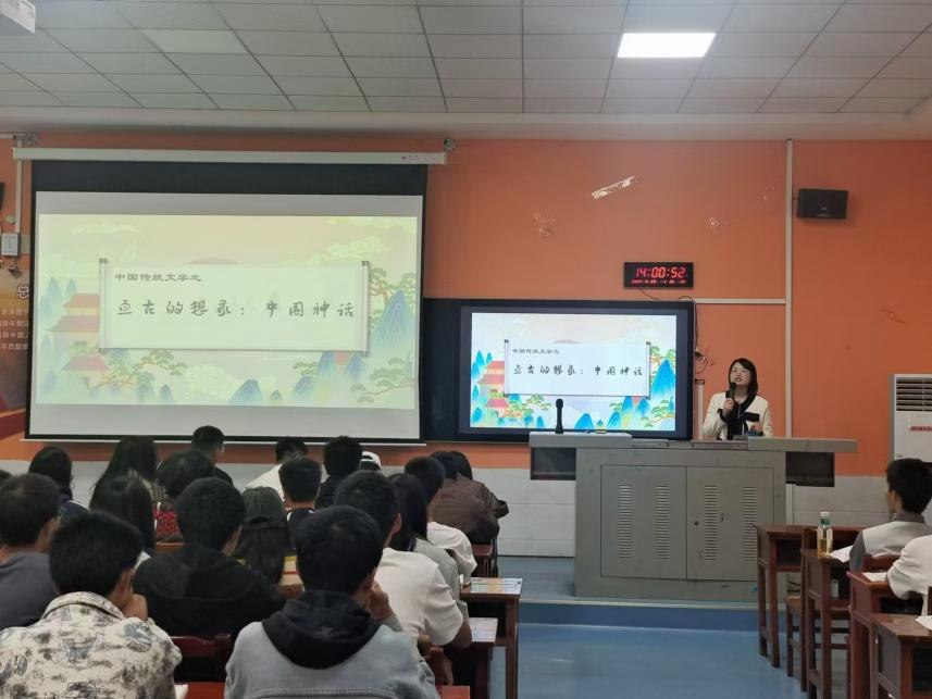 本次主题为《中国 传统文学之神话》,陈老师首先以“我把神话讲给你听”为主题,通过展示学生课前学习成果,充分调动了学生的积极性与主动性。在学生讲诉完成后,针对学生的表现进行生生互评、教师讲评,使得学生充分、全面掌握知识点,充分展现了以学生为主体的课堂教学模式。