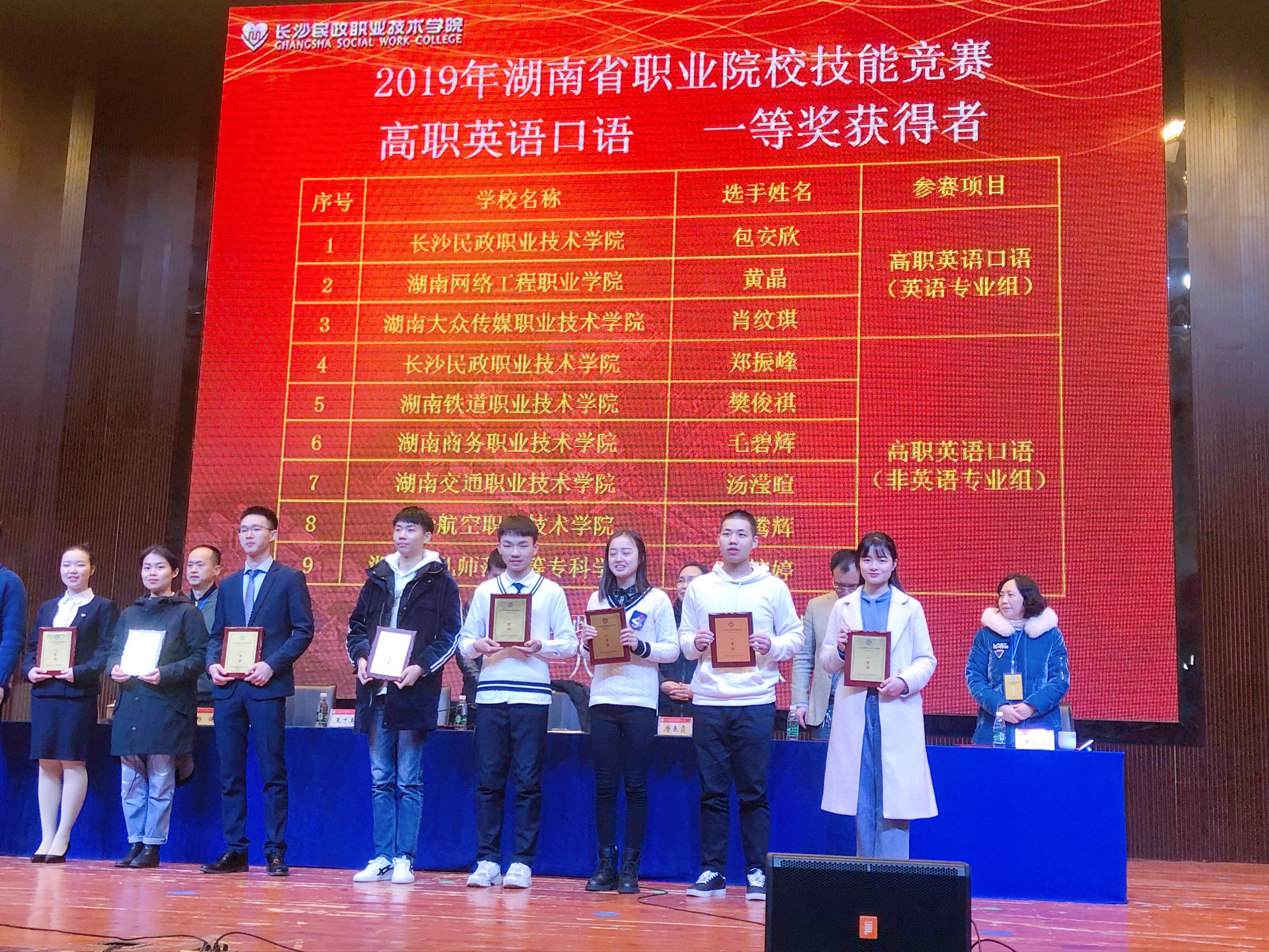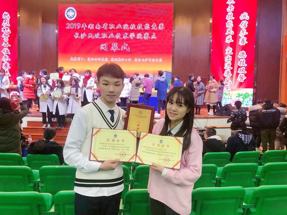 12月28日,2019年湖南省职业院校英语口语技能竞赛在长沙民政职业技术学院举行。在非英语专业组的竞赛中,由基础课部公共英语教研室聂点点老师指导的毛碧辉同学,表现出色,在来自全省56所高职院校的56名非英语专业选手中脱颖而出,荣获一等奖。