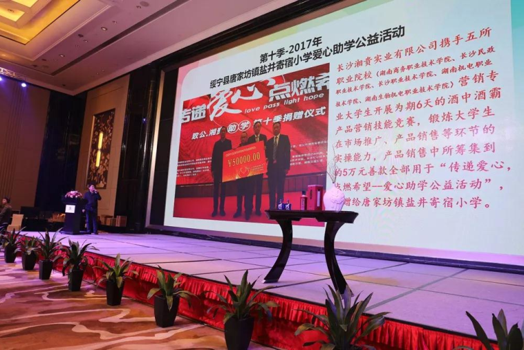 最是真情暖人心,唯有大爱不留痕。2019年1月14日下午,由共青团湖南省直工委、致公党湖南省委社会服务工作委员会、致公党长沙市委社会服务工作委员会指导,贵州酒中酒集团、香港致信管理咨询机构、长沙湘贵实业有限公司支持,湖南沃成科技有限公司、湖南商务职业技术学院主办的 “传递爱心•点燃希望” 助学公益活动(第十一季)捐赠仪式在长沙运达中央广场瑞吉酒店宴会厅举行。省人大常委、致公党湖南省委专职副主委向佐谊,致公党省委副主委、致公党长沙市委主委、长沙市人大常委会副主任王国海,贵州酒中酒集团董事长曹本强,长沙市人民政府副秘书长王体泽,湖南省政协常委、原致公党省委副主委骆伟,湖南省供销合作总社巡视员彭建国,原湖南省商务厅副巡视员、原湖南省酒业协会会长易昌伦,原湖南省商务厅副巡视员刘飞,原湖南省工商行政管理局副巡视员文先励,原湖南省工商行政管理局副巡视员余延志,原湖南省工商行政管理局副巡视员伍作法,湖南商务职业技术学院副院长杨文涛,共青团湖南省直工委副书记张景贤,致公党长沙市委专职副主委、长沙市政协副秘书长枭燕,湖南沃成科技有限公司董事长、酒中酒霸全国营销中心总经理、致公党湖南省委社会服务工作委员会主任、致公党长沙市委常委王静等领导出席捐赠仪式。参加捐赠仪式的还有湖南沃成科技有限公司管理人员及员工代表、湖南商务职业技术学院老师代表、新化县琅塘镇龙通完小学校负责人及社会各界爱心人士、受邀嘉宾。