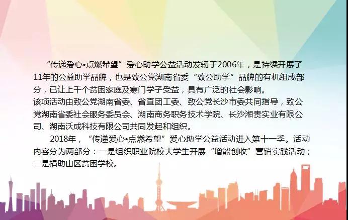 2018年在致公党湖南省委、致公党长沙市委的指导下,湖南沃成科技有限公司捐资20万元和湖南商务职业技术学院继续合作开办了“致公•沃成班”,帮助50名来自山区的经济贸易学院市场营销专业学子完成学业。在2018年10月启动的第十一季“传递爱心•点燃希望” 助学公益活动中,“致公•沃成班”学生参与宋代官窖、酒中酒霸在全国秋季糖酒会的品牌推广招商活动,锻炼学生的实践能力,同时从招商奖励中提取五万元善款,捐赠给新化县琅塘镇龙通完小,给山区的孩子传递一份爱心和温暖。