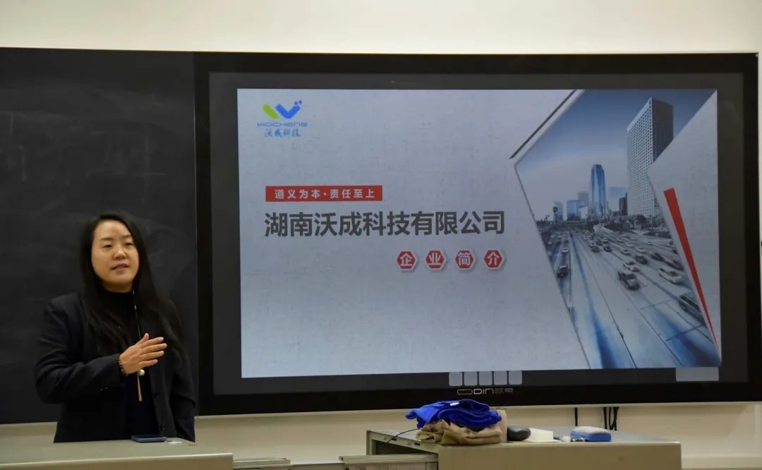 随后,校企代表邓美香给大家讲述了湖南沃成科技有限公司的基本情况,并对企业文化及相关部门的介绍,整个交流会现场热情洋溢,气氛轻松活跃。