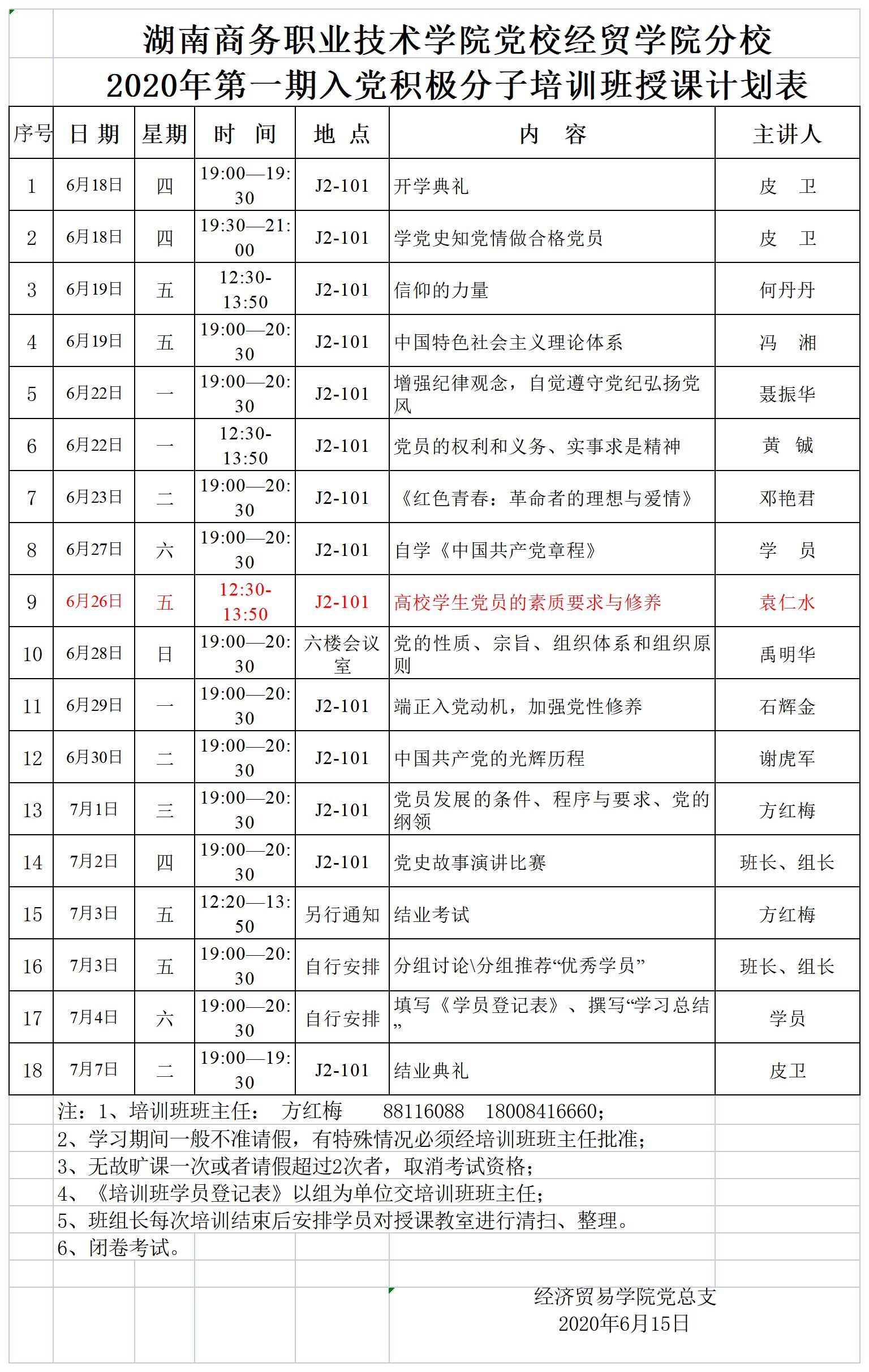 湖南商务职业技术学院党校2021年下半年党员发展对象培训班授课计划表
